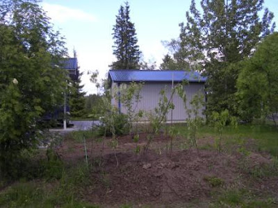 Visserligen blommade de överdådigt redan första sommaren men små var de. Hoppas de blommar i sommar. Ifjol blev det inga blommor, all deras kraft gick nog åt till att växa. För tio dar sedan strödde jag kogödsel över rabatten, nu syns det inte längre för det gröna som börjat sticka upp. Bambuställningen markerar en Kaprifol som lyckats överleva tre vintrar här uppe. Hoppas det blommar i sommar! Är det någon som har ett tips på en bra klätterställning till den skulle jag vara tacksam, den behöver ju läggas ner mot marken för att få skydd av snön mot vinterkylan och då skulle jag vilja ha nåt bättre än bambupinnarna för den att klättra på men ändå nån ställning som går att lyfta bort när vintern kommer.